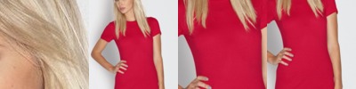 - Contrast color coverstitched neck, shoulders, armholes, and cuffs